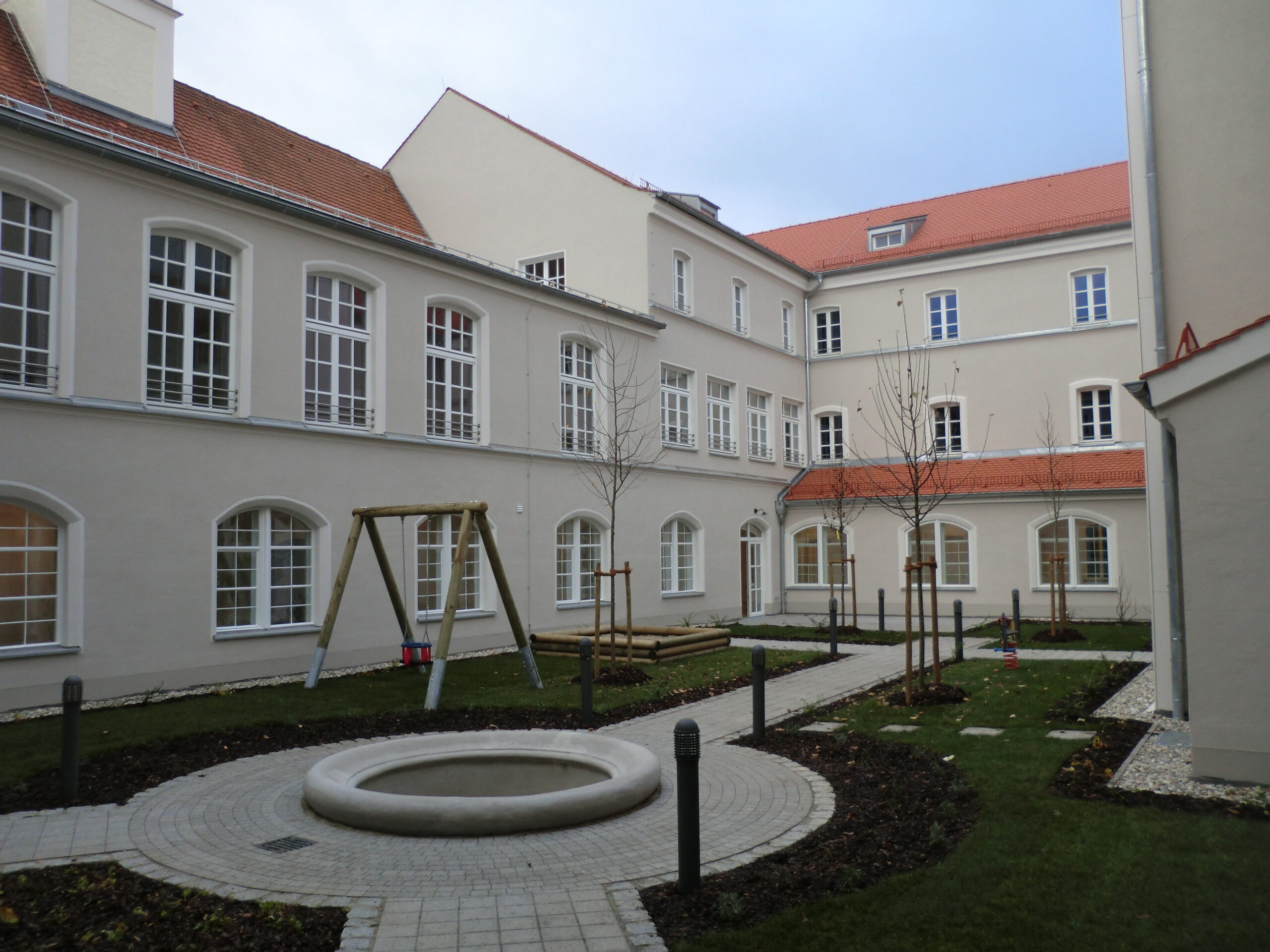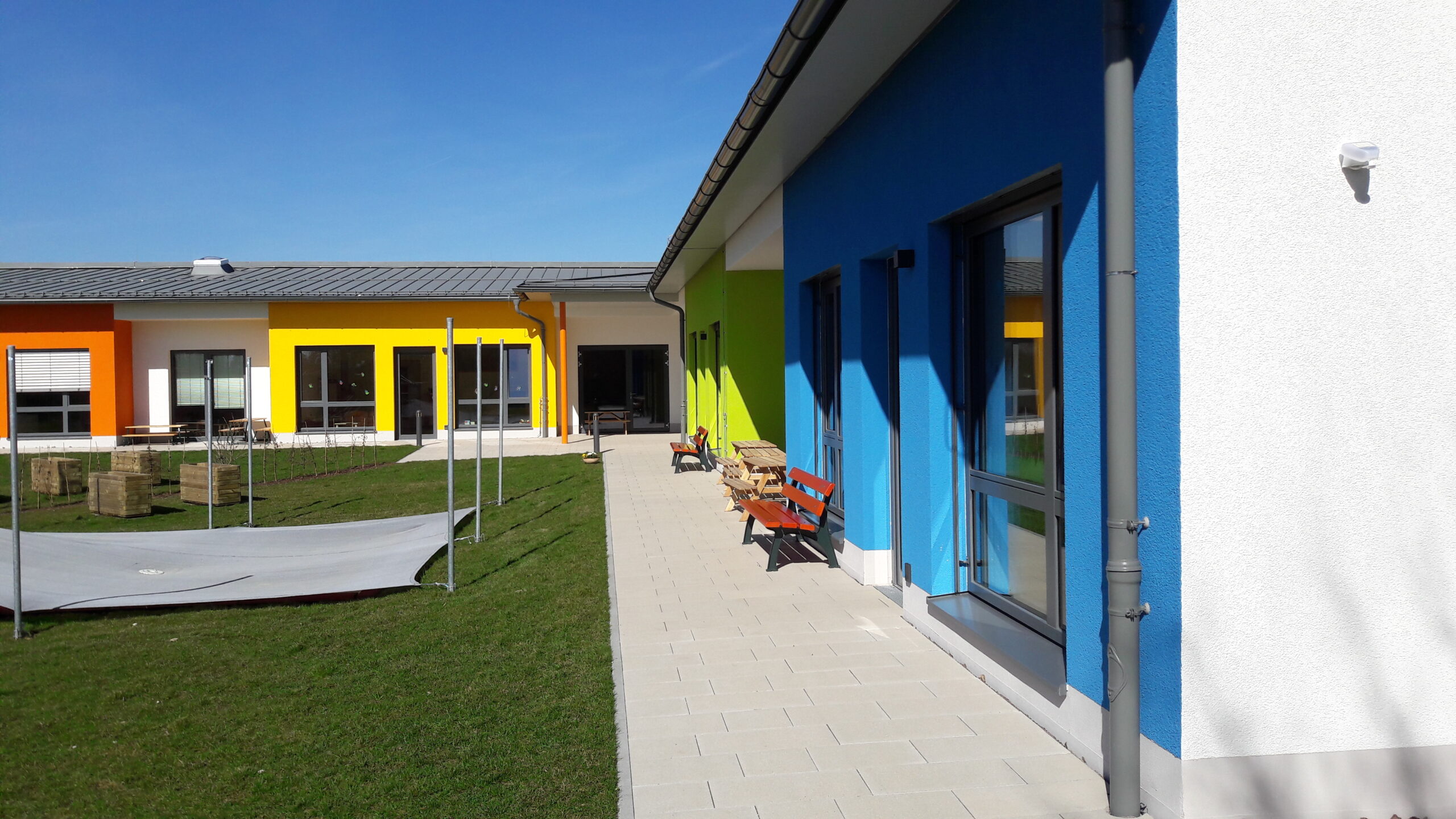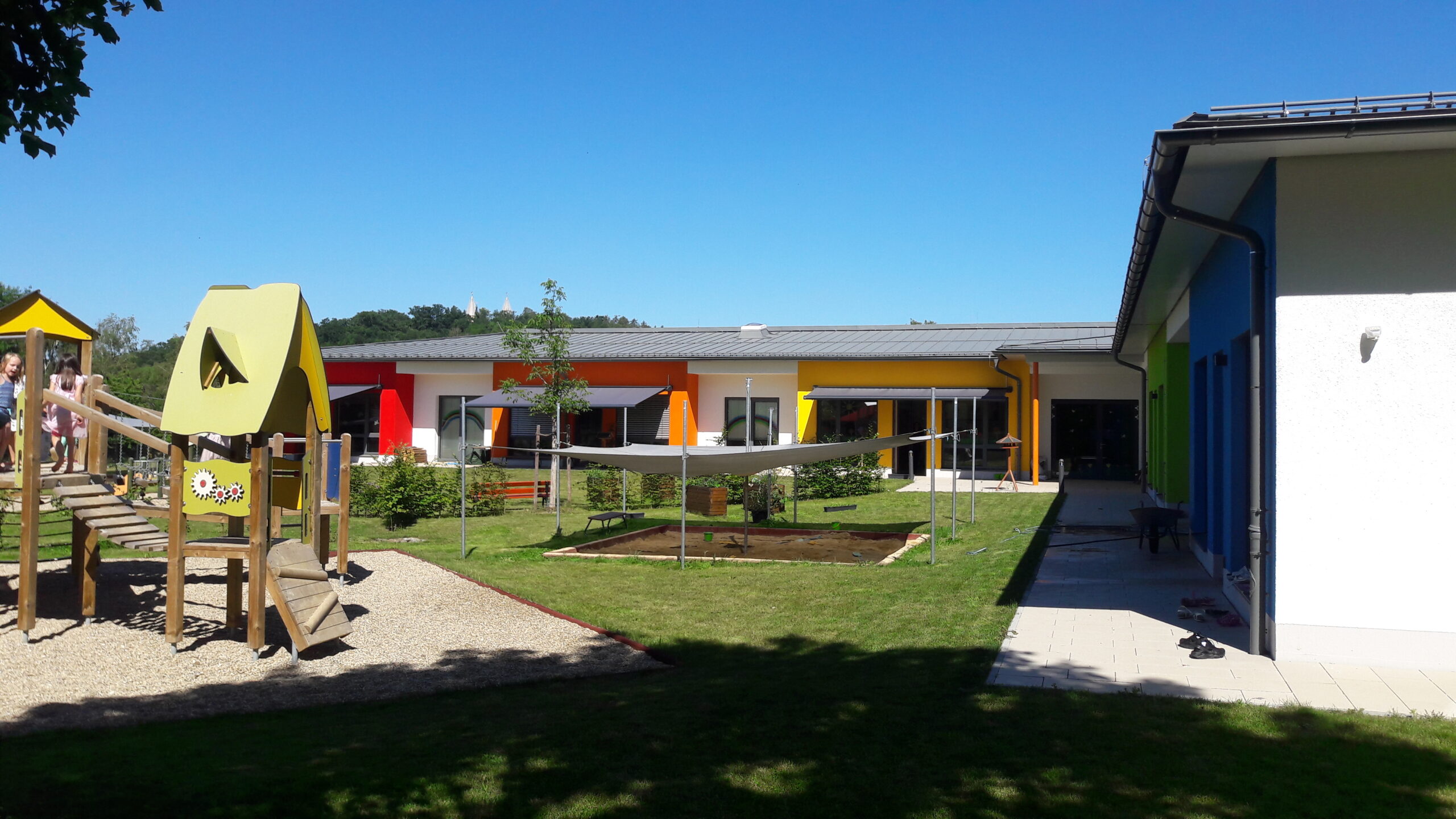 Der L-förmige – nach der Erweiterung Z-förmige – Baukörper mit Walmdach umschließt einen zentralen großen Außenspielbereich. Nach der Erweiterung wurde dieser noch vergrößert.