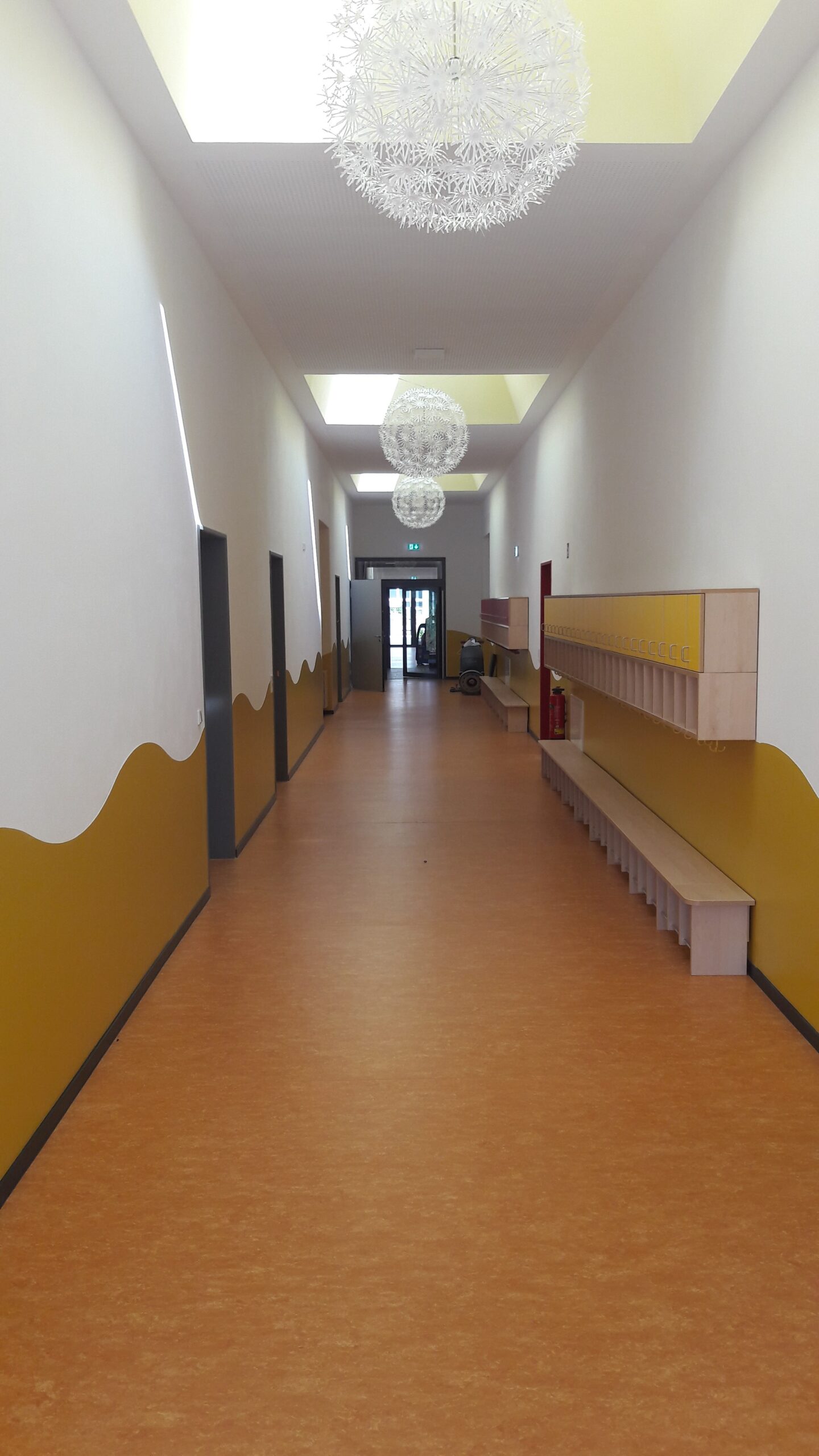 Das eingeschossige Kinderhaus wurde mit zwei gegeneinander versetzten Pultdächern errichtet und hat einen eingeschossigen Flachdachanbau.